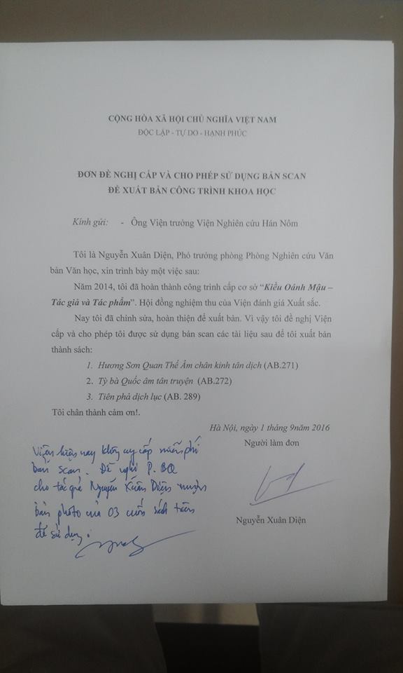 Năm 2014, tôi hoàn thành công trình “Kiều Oánh Mậu – Cuộc đời và Tác phẩm” được nghiệm thu xuất sắc. Tôi nhiều lần đề nghị lãnh đạo Viện đưa vào kế hoạch in bản thảo này thành sách, nhưng đều bị từ chối vì không có kinh phí. Đến khi tôi phải tự vận động và được Ông Bà Hàn Mạnh Tiến – Phạm Minh Tân giúp tiền in 500 bản bìa cứng. Cuốn sách này cần được in kèm chữ Nôm và tôi đã làm đơn đề nghị lãnh đạo Viện Nghiên cứu Hán Nôm cung cấp bản Scan để in vào sách (cuốn sách là công trình Viện tổ chức triển khai và quản lý, được nghiệm thu xuất sắc, khi in có tên cơ quan) nhưng Viện trưởng Viện Nghiên cứu Hán Nôm thẳng thừng từ chối và nói tôi phải mua với giá 15.000 đ/ trang, vì Viện không cung cấp miễn phí bản scan. Vì kinh phí có hạn, tôi chỉ dám dùng bản photocopy mà không thể có đủ tiền mua bản Scan màu của Viện Nghiên cứu Hán Nôm.