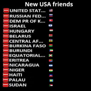 Do tin vào những thông tin như vậy, nên nước Mỹ mới có “thành phần ưu tú” là MAGA xuất hiện. Kết quả là, nước Mỹ thời nay chẳng những không lên án Nga xâm lược Ukraine, mà đứng về phía Nga chống lại Ukraine, cho rằng Ukraine đã xâm lược Nga! Xem danh sách Mỹ đã cùng 17 nước khác bỏ phiếu chống nghị quyết lên án Nga xâm lược Ukraine tại Liên Hiệp quốc, có thể thấy những người bạn mới của Mỹ không chỉ có Nga, mà còn có Bắc Hàn, Belarus, Hungary, Sudan…