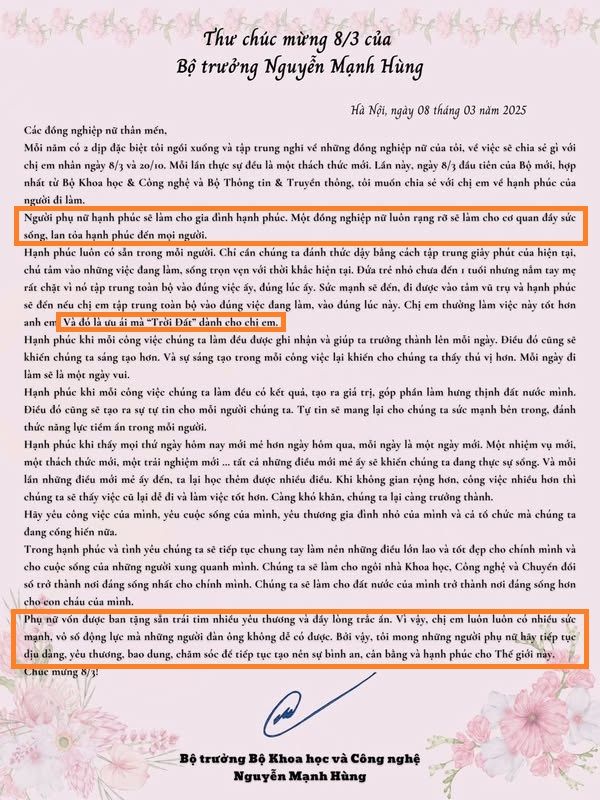 Hôm nay tôi đọc được lời chúc 8-3 từ Bộ trưởng Nguyễn Mạnh Hùng. Ông viết như sau:
