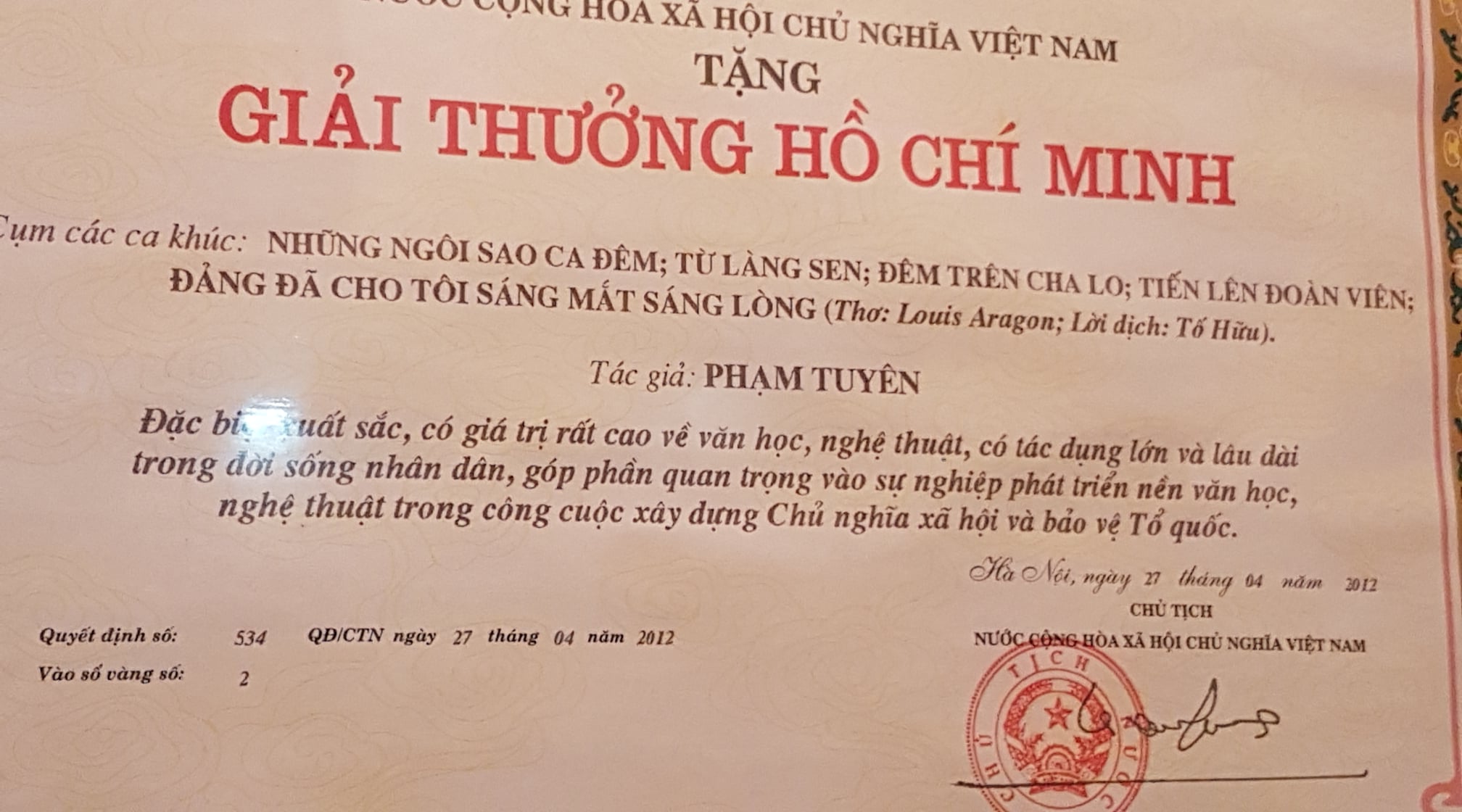 Rồi cuối cùng, người ta cũng miễn cưỡng trao giải cụ Hồ cho ông nhạc sĩ già, vào năm 2012, do Trương Tấn Sang ký, chả biết có phải một phần do nghe được lời phàn nàn tâm sự kia không. Bài “Tiến lên đoàn viên” nằm trong cụm 5 tác phẩm được giải Hồ Chí Minh, có lẽ xứng đáng nhất, chứ 4 bài kia rất xoàng (gồm: Những ngôi sao ca đêm, Từ làng Sen, Đêm Cha Lo, Đảng đã cho tôi sáng mắt sáng lòng).