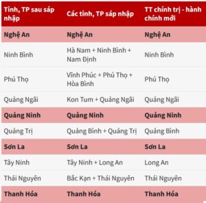 Ngoài số tỉnh thành nói trên, 52 địa phương còn lại sẽ sáp nhập còn 23 tỉnh, thành. Cả nước sẽ còn 34 đơn vị hành chính cấp tỉnh, gồm 28 tỉnh và 6 thành phố trực thuộc trung ương.