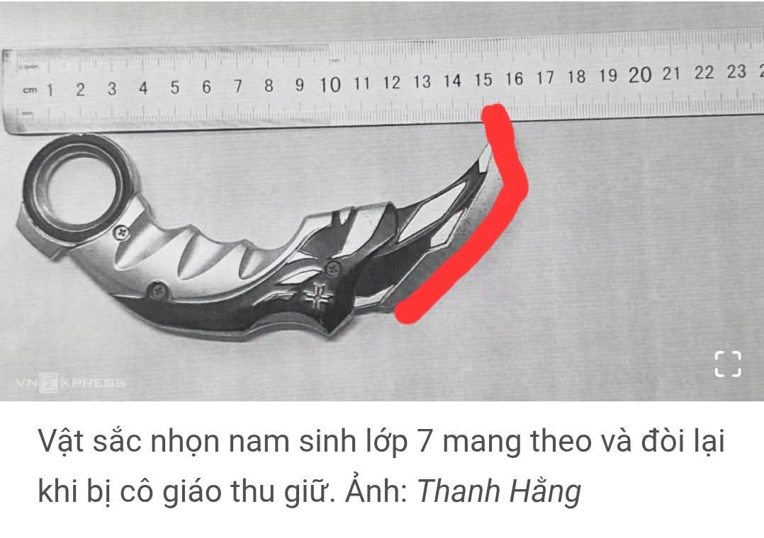 Mình xem vật nhọn mà cô tịch thu, nó có vẻ như là một món đồ chơi mẫu từ game, rất đẹp. Đồ chơi, chứ không phải hung khí như dao, nhưng là đồ chơi có thể nguy hiểm. Đồ này mà được bán tự do, thì phải xem lại các cơ quan quản lý thị trường. Vật nhọn này mình không chắc là bằng kim loại mà có thể là bằng nhựa.