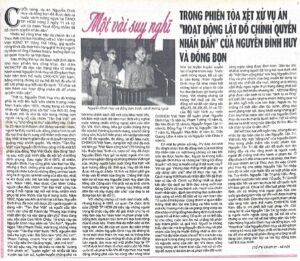 – Tuyên bố: Nguyễn Đình Huy (tức Nguyễn Việt Thắng, Việt Huy, Năm và Ngô Trần Luận), Phạm Tường (tức Phạm Toàn), Bùi Kim Đính (tức Việt Hùng, Trần Thúc Vũ, Trần Phiên Ngung, Hoàng Miên, Đính), Nguyễn Ngọc Tân (tức Phạm Thái, Phạm Tử Sản, Bảy Bóp), Đồng Tuy (tức Việt Phong, Trần Phong), Nguyễn Tấn Trí, Nguyễn Văn Biên và Nguyễn Văn Châu, đều phạm tội “Hoạt động nhằm lật đổ chánh quyền nhân dân” theo qui định tại điều 73 Bộ luật hình sự.