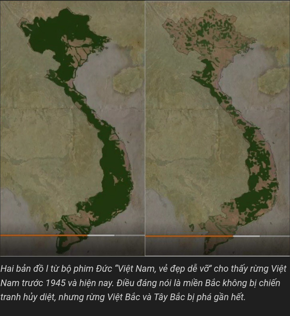 1. Rừng nguyên sinh ở Việt Nam hiện chỉ còn 0.25%, nói cách khác là đã bị xóa sổ. Điều đáng kinh ngạc là trước 1945 con số này là khoảng 45%. Trong 30 năm tiếp theo (1945-1975) giảm xuống còn khoảng 20%. Đến năm 1990 rừng nguyên sinh gần như biến mất, chỉ còn từ 1-2%.