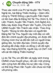 UBND huyện Yên Thành xác nhận việc đổi tên và cấp chứng minh thư mới tháng 6/2018. Loạt bài này hiện đã bị xóa, chỉ còn ảnh chụp màn hình của Chuyển động 24h VTV.