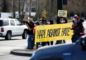 Ảnh minh họa: Người biểu tình cầm biểu ngữ mang dòng chữ “AAPI Against Hate” (Cộng đồng AAPI chống lại sự thù hận) trong một cuộc biểu tình phản đối các tội ác thù ghét nhằm vào người châu Á, do Liên minh Tổ chức AAPI chống lại sự thù hận và định kiến ​​tổ chức tại Newcastle, Washington. Nguồn: Lindsey Wasson/ Reuters.